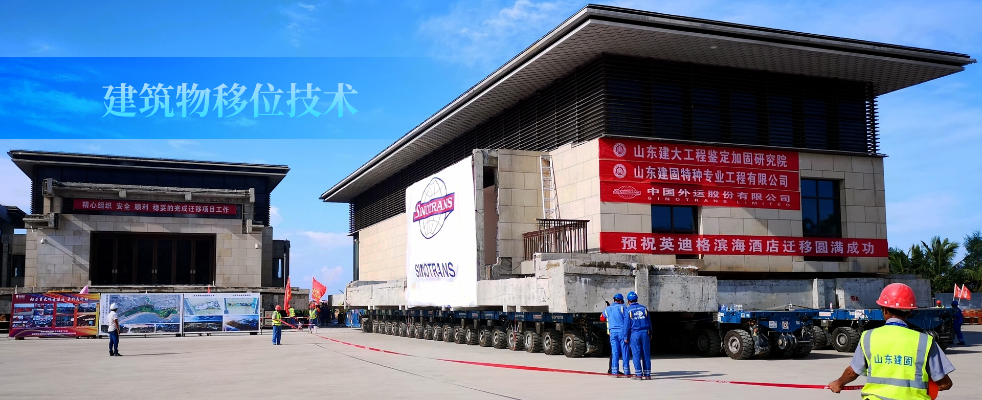 海南紅塘灣酒店為地下1層、地上2層鋼筋混凝土框架結構。占地面積約2400㎡,總建筑面積4658㎡。遷移直線距離約500米,豎向頂升2.3米。紅塘灣酒店遷移工程的成功就位,標志著一個新的記錄誕生:目前國內外首例不規(guī)則扇形車輛布置、國內拖車移位單體建筑面積最大(4658㎡)、國內拖車移位單體建筑重量最重(7500噸)。山東建筑大學工程鑒定加固研究院、山東建固特種專業(yè)工程有限公司成立于1992年,三十年一直秉承“篤志疑難躬行求新”的企業(yè)精神,完成建筑物鑒定與加固改造、建筑移位、建筑糾傾項目六萬余項。山東萊蕪高新區(qū)辦公樓平移項目,建筑面積24000㎡,重量35000噸,是國內外最重平移工程;主持完成的
